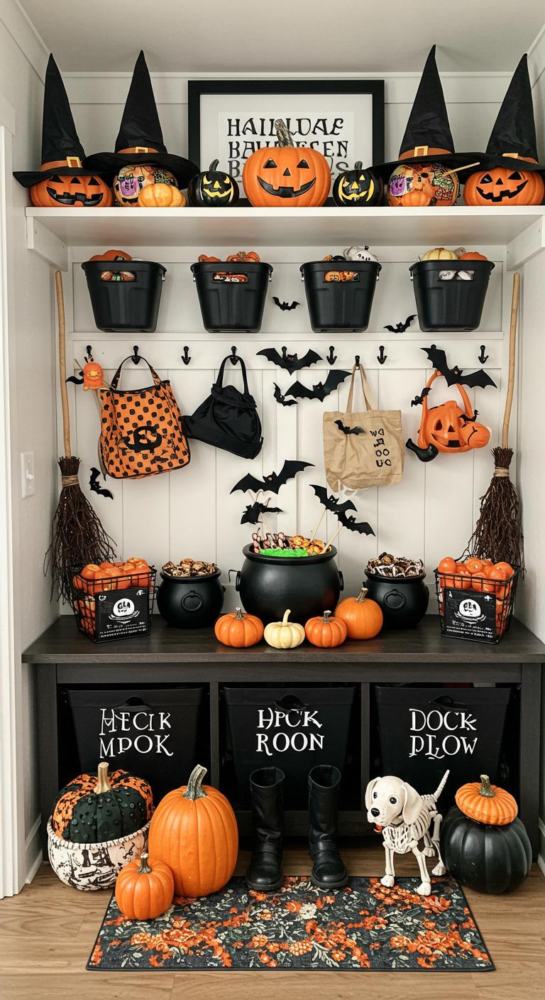This blend of organization and decoration guarantees a festive yet functional mudroom for all Halloween festivities.
