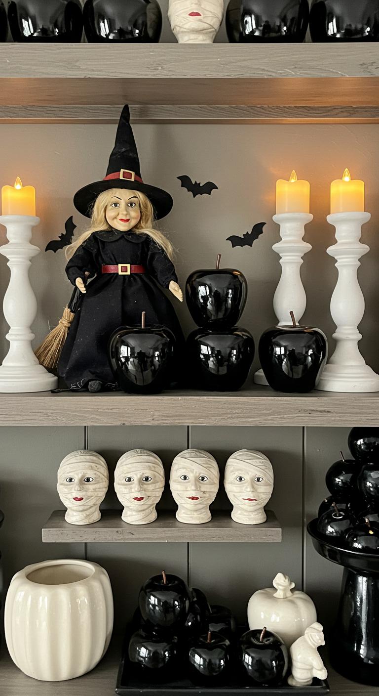 A delightful array of witch decor can transform a baker’s shelf into an enchanting Halloween display. Incorporating a vintage witch doll among glossy black apples and white candlesticks adds a charming focal point. To heighten the spooky atmosphere, small black bats and white mummy heads can be scattered across the top. Mixing matte and shiny finishes creates visual interest, while varying the heights of items guarantees a dynamic look. Adding LED candles provides a warm glow in the evening, enhancing the overall ambiance. This approach delivers a whimsical yet sophisticated touch, perfect for those seeking innovative Halloween decor ideas.