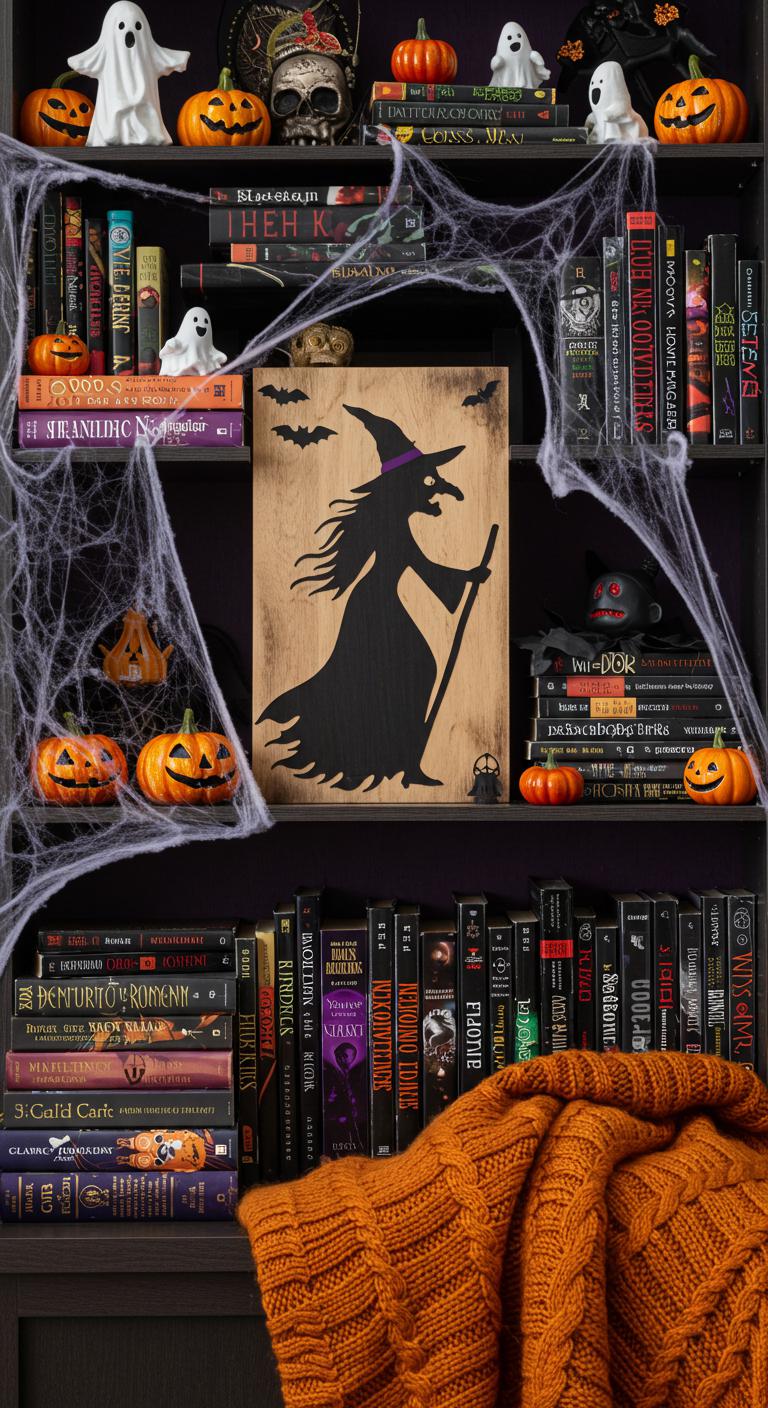 To enhance the spooky accents, consider draping fake cobwebs and adding tiny pumpkins or ghostly figurines throughout the shelves. A simple wooden poster of a witch serves as a fascinating focal point, while a deep purple or black background amplifies the eerie ambiance.
