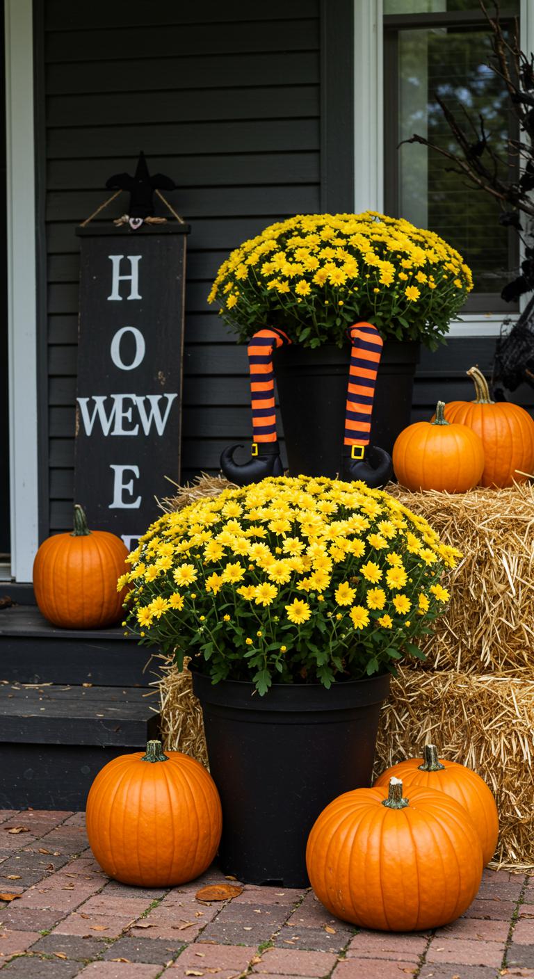 Imagine sturdy pots filled with cheerful yellow mums, with charming witch feet peeking out, creating whimsical displays that capture attention. This unique porch decoration idea pairs wonderfully with autumn elements like vibrant orange pumpkins and rustic straw bales.