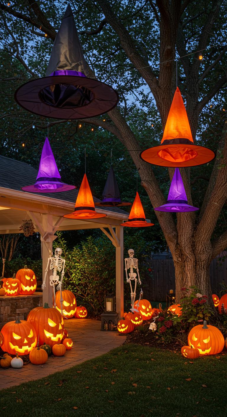 Hanging witches’ hats can transform any outdoor space into a whimsical Halloween wonderland.