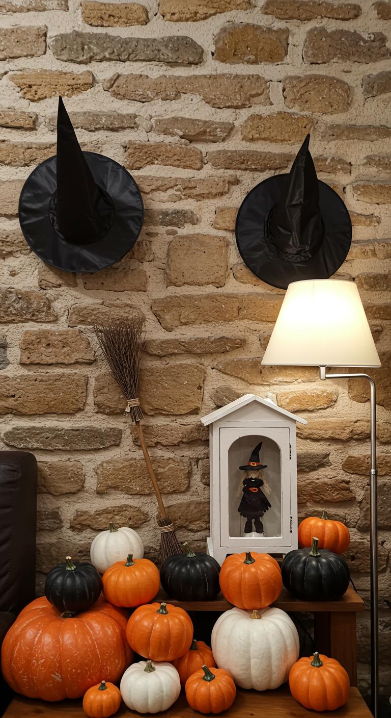 A stone wall can serve as an enchanting backdrop for Halloween witch decor, transforming an ordinary space into a bewitching display. Utilizing stone wall accents, one can hang two pointed black hats side by side for a whimsical touch.