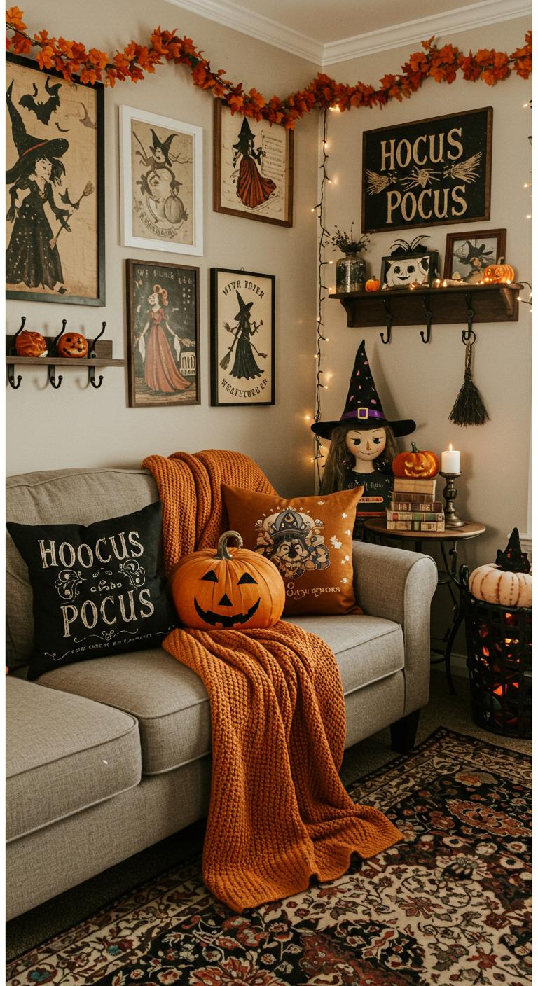 The living room can easily become a magical haven for Halloween with the right witch decor elements.