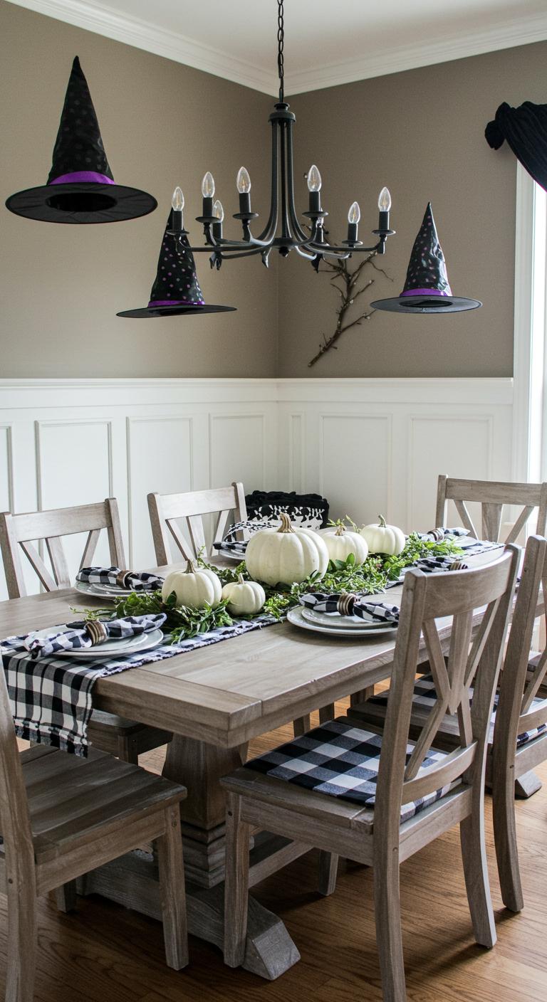 To enhance the witchy vibe, hang whimsical witches’ hats above the dining table, creating a focal point that captures attention.