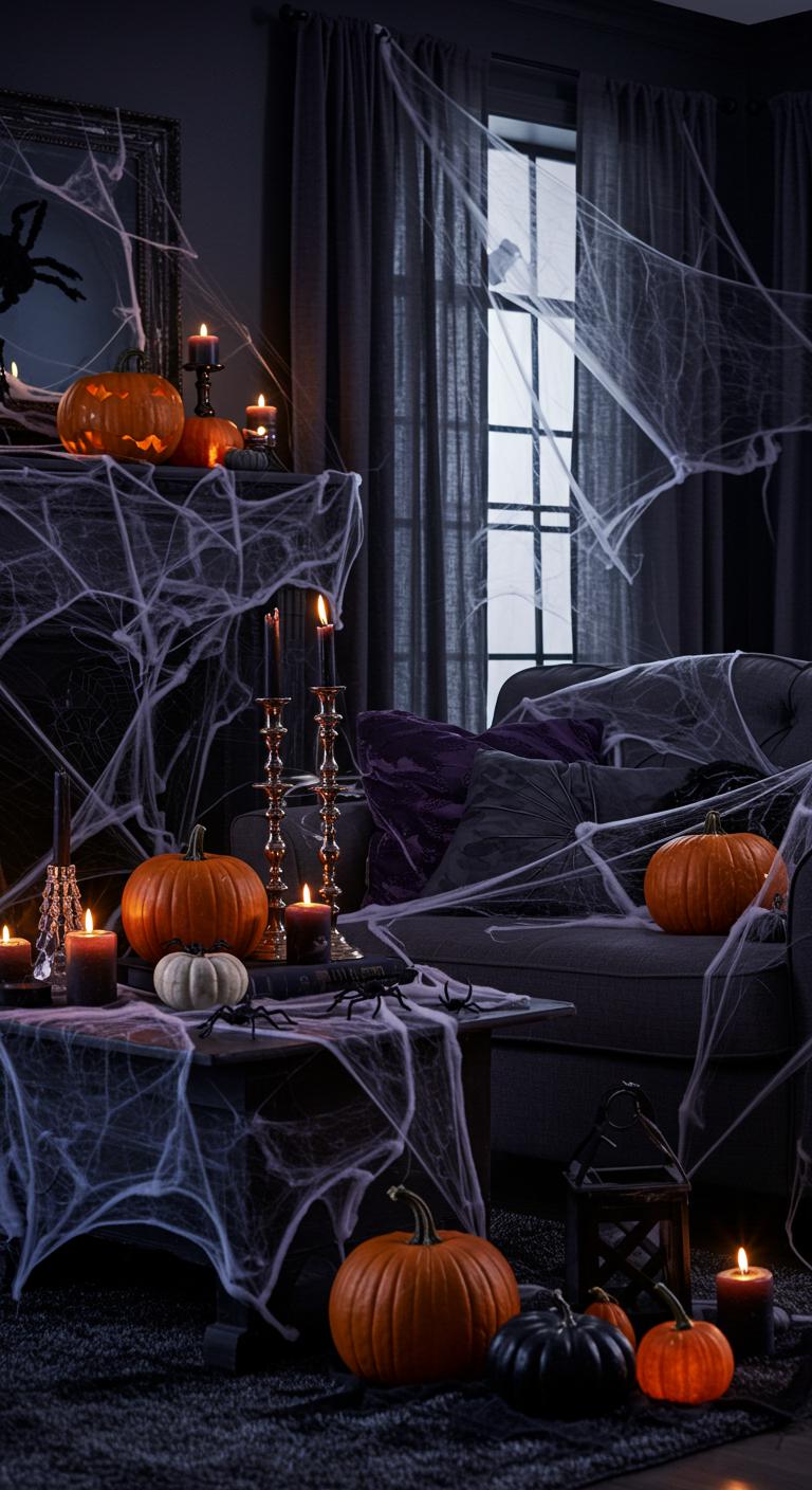 Opt for a color palette of deep purples and charcoal grays, accentuated by soft white webs that contrast against dark furnishings.