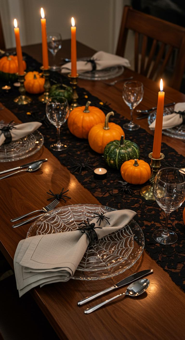 Envision elegant black lace runners cascading over rich wooden tables, complemented by shimmering glass plates adorned with spider web patterns.