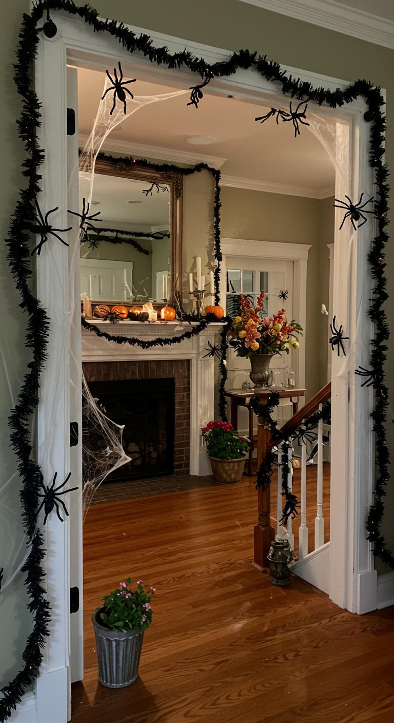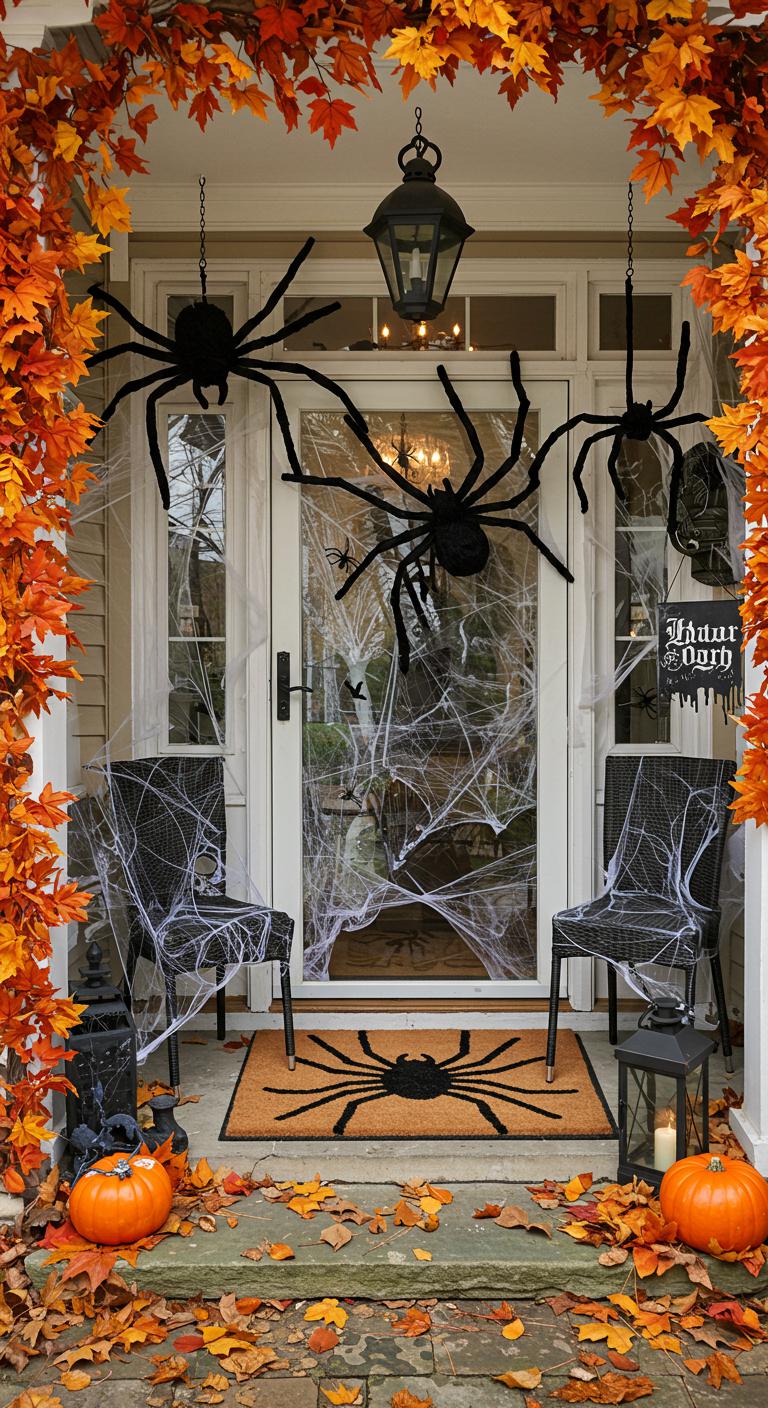 Seasonal spider accents, like faux webs cascading down staircases or nestled in potted plants, create an inviting yet eerie atmosphere.