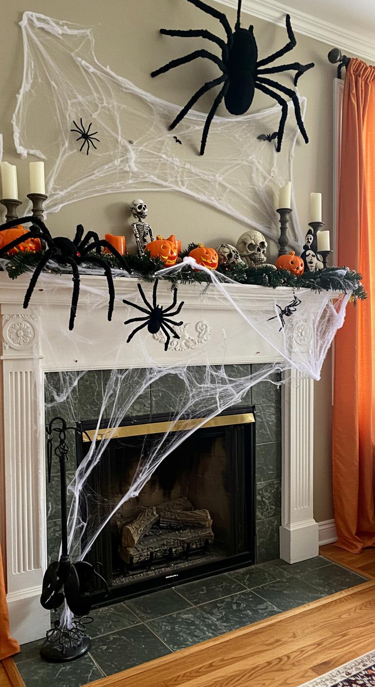 A cascade of eerie white spider webs drapes over the stone facade, while realistic spiders nestle among black and orange mantel accessories.
