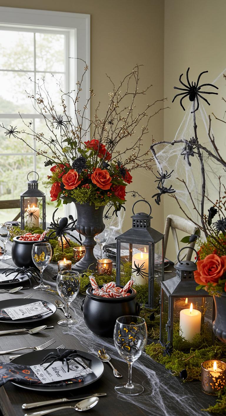 Intricate spider centerpiece arrangements can feature black cauldrons brimming with candy, or striking floral displays adorned with delicate spider accents.