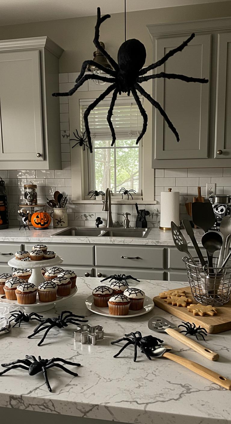A giant spider suspended above cabinets casts an eerie shadow, while countertops showcase a scattering of realistic black spiders among rustic decor.