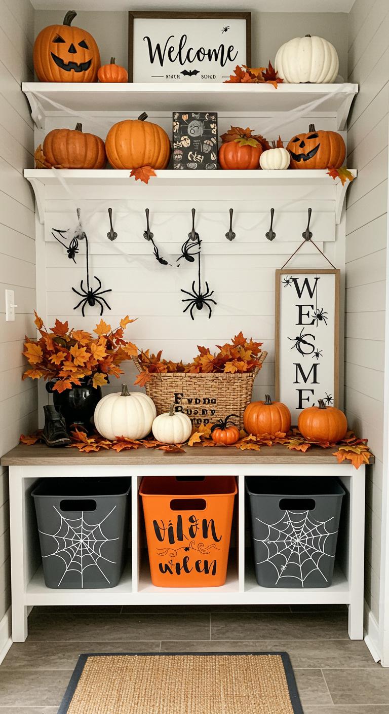 Creating a welcoming yet spooky atmosphere in the mudroom sets the tone for the Halloween festivities that lie ahead. This space can be transformed with clever mudroom organization and spooky storage solutions. Enchanting faux spider webs cascade from hooks, while strategically placed plastic spiders create an inviting fright. Pumpkins in vivid oranges and whites rest on shelves, complemented by autumn leaves strewn across surfaces. A whimsical welcome sign adorned with spider motifs beckons guests to enter. Creative storage bins, painted with Halloween themes, hide away seasonal gear, blending functionality with festive flair for a truly haunted entryway experience.